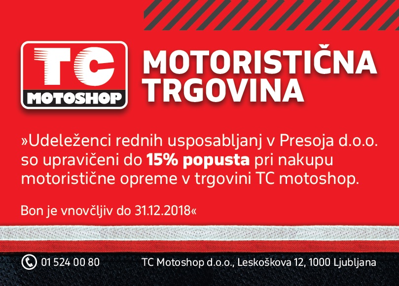15 Feb 15. 02. 2018 v Obvestila, Usposabljanja Udeleženci naših usposabljanj so upravičeni do 15 % popusta pri nakupu določene motoristične opreme v najboljši slovenski motoristični trgovini!